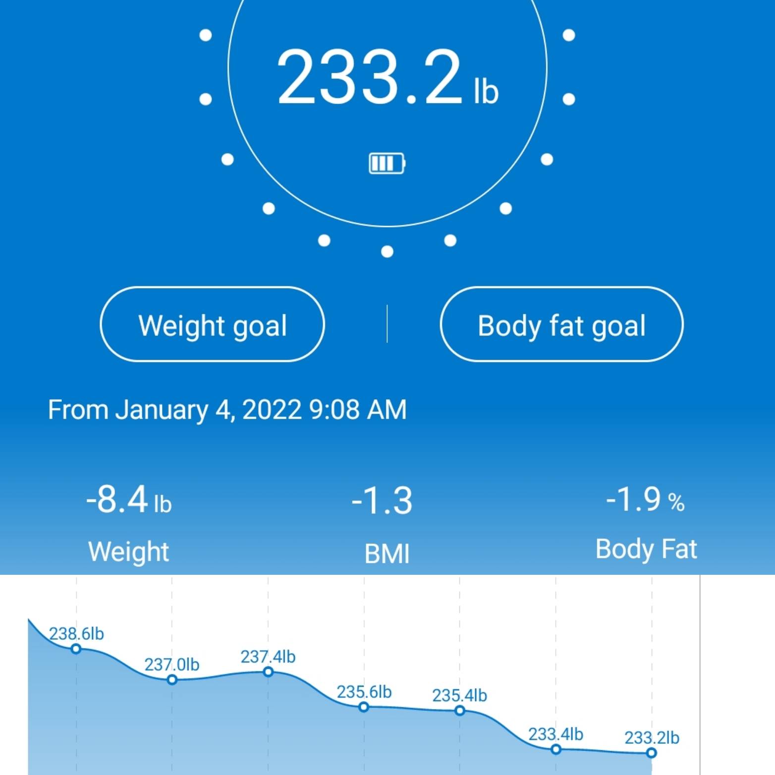 I am entering week 2 of this journey and so far so good. The scale says down 8.4 lbs. Now I believe this is mainly because those extra lbs were simply what I call food weight. No that’s no any kind of medical term, this is simply my statement and opinion of what happens when you more good than normal over a short period of time , such holidays, parties or tailgating. Any way it will definitely be interesting once I reach 220. That’s my stall weight and I am determine to break this barrier this time.