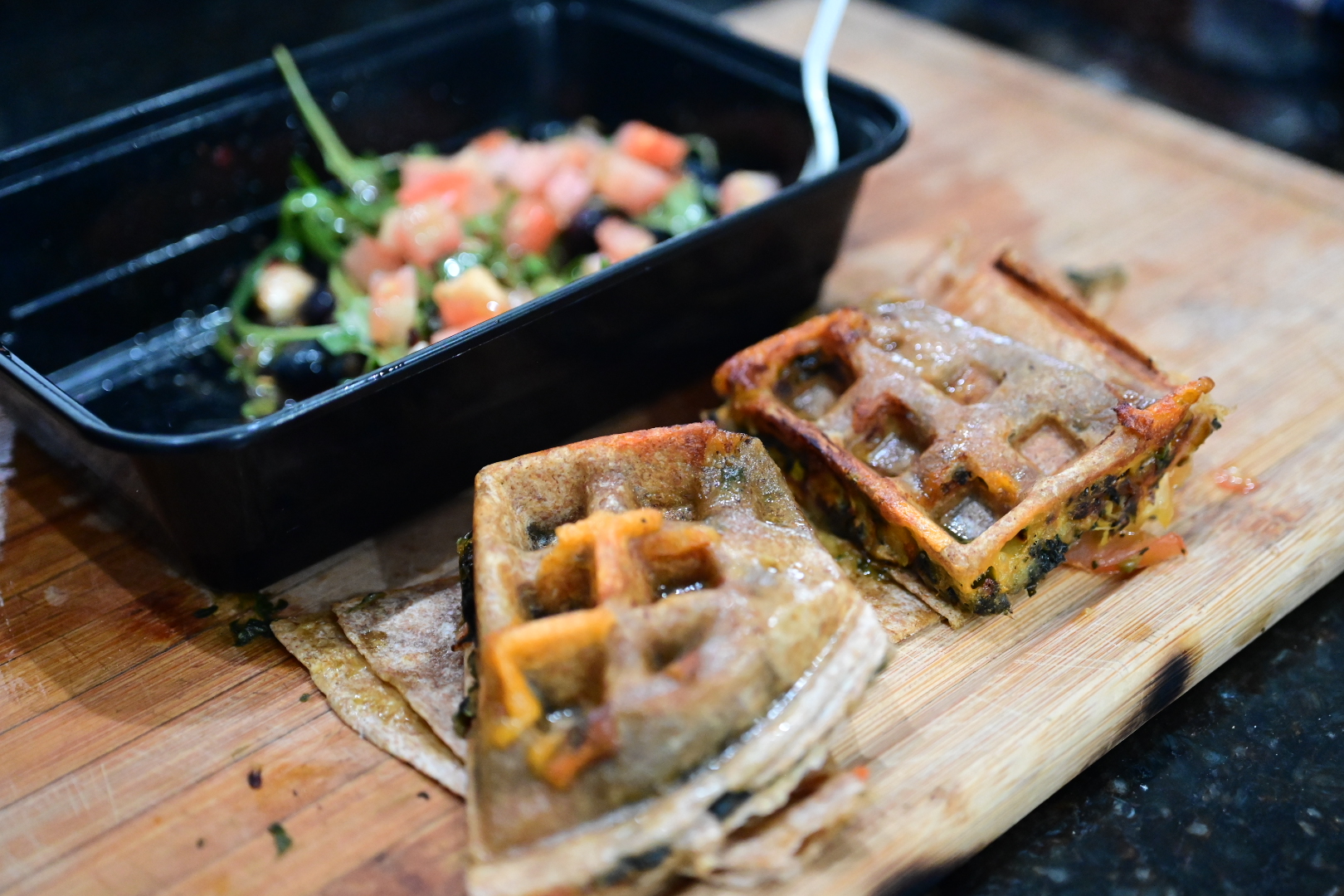 Today’s food was a mashup of a food hack I saw and the last of the meal prep for the week. I took the spinach and squash and roasted it up. Next added some tomato slices and placed in Burrito in a waffle iron combined with the arugula salad.